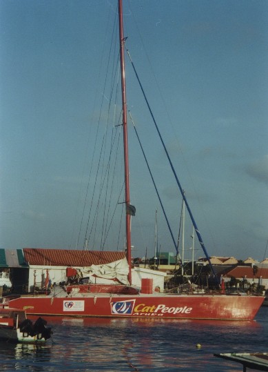 Cat People is a supercatamaran, 70 feet long and 38 feet wide (beam). Their website gives you the full story of the cat. It was used to circumnavigate the world three times before.