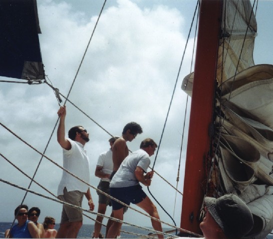 Because of the sail not being usable, and the weather getting rougher, we did not make it to the coast of Venezula. Dad suggested to the captain that he give us all free T-shirts. So he did!