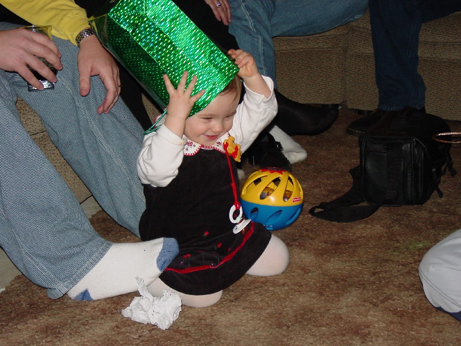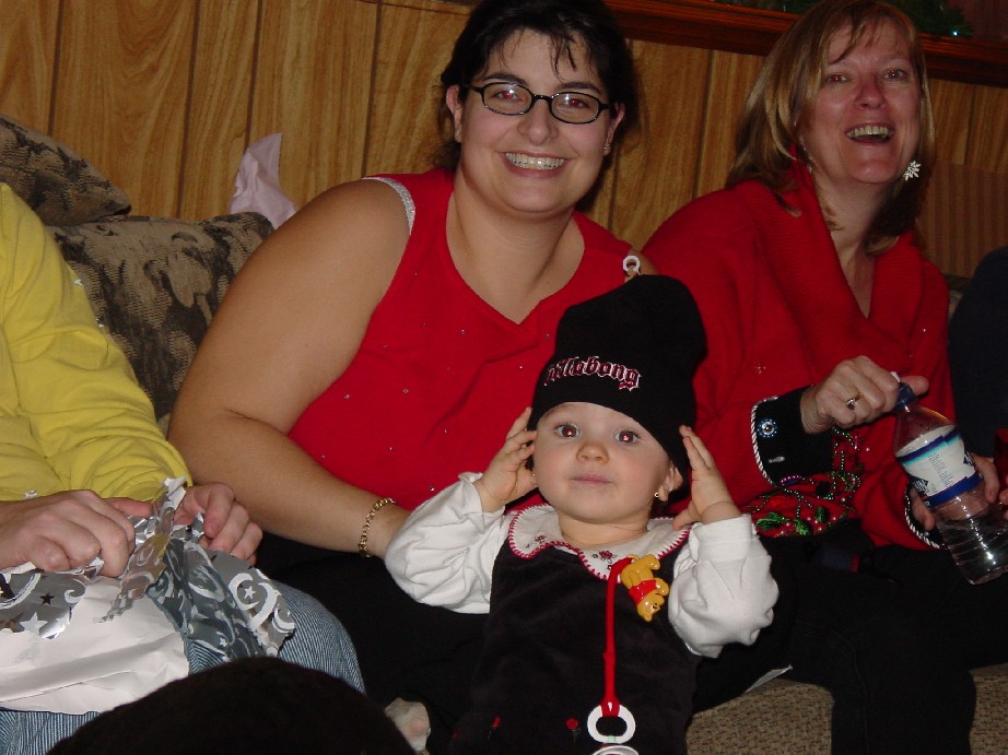 her daddy's new hat as Mom Nicole & Grandma Doreen look on.